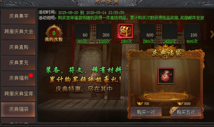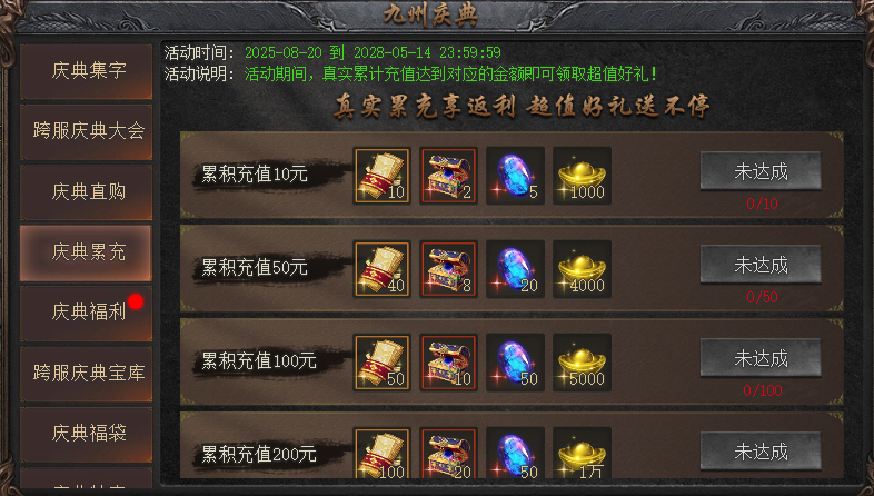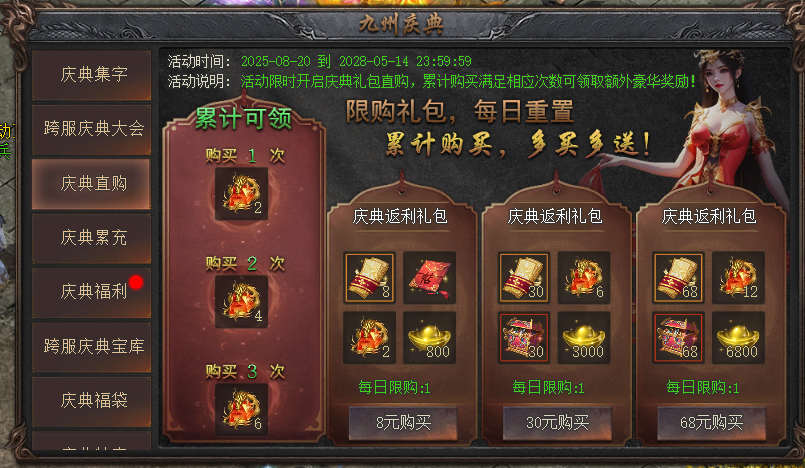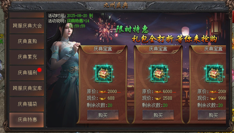 「庆典特惠」消耗元宝购买庆典福利礼盒,获取海量资源;