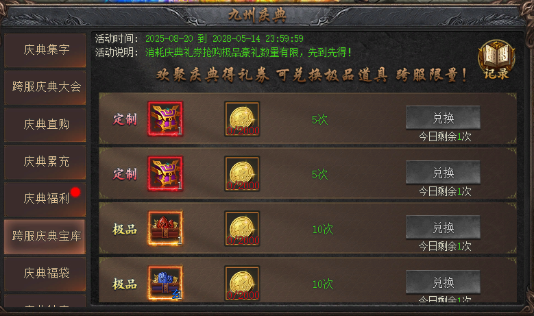 「庆典宝库」消耗庆典券,全服兑换指定道具,全服限量;